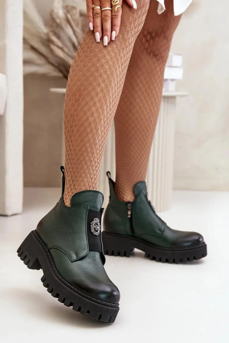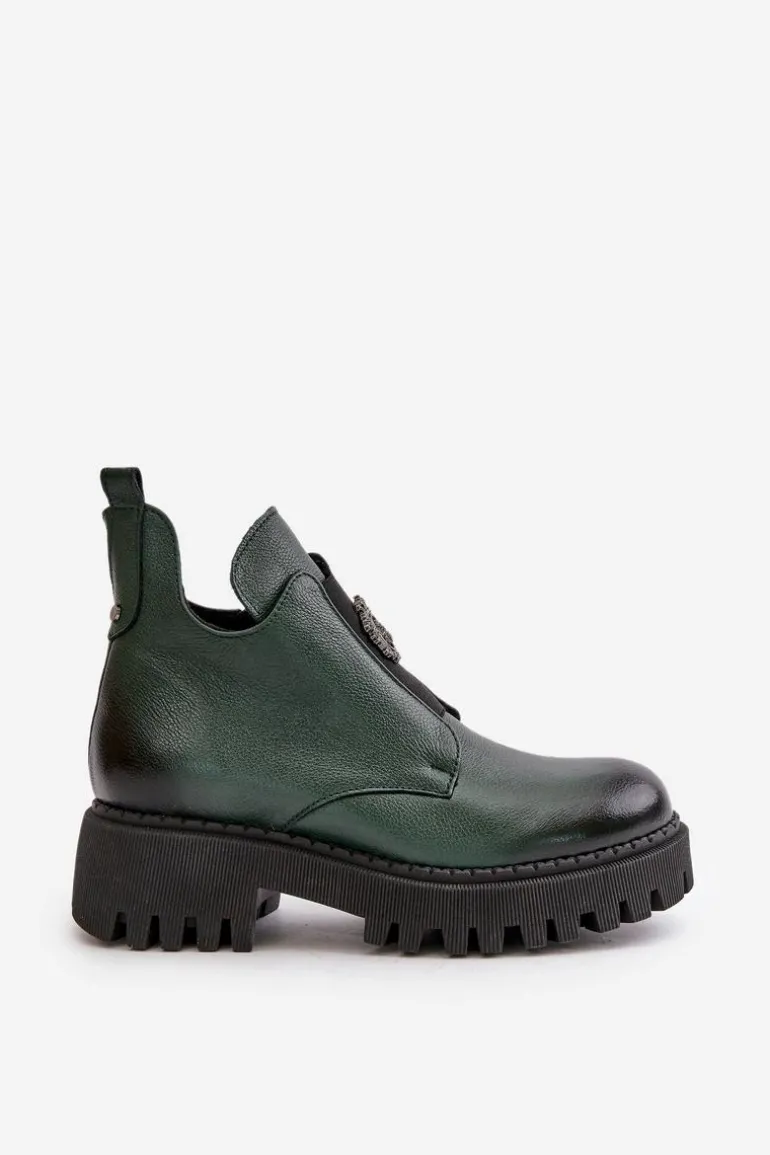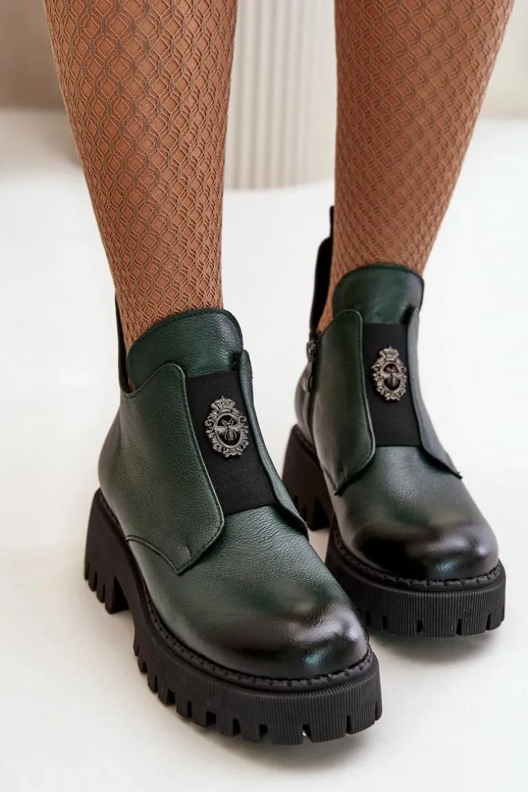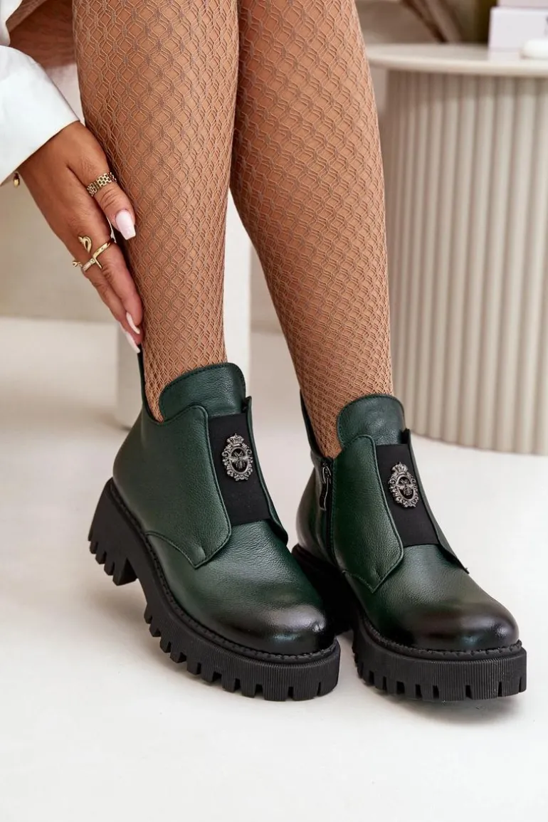 Damskie botki zostały wykonane z wysokiej jakości naturalnej skóry. Osadzone na masywnym obcasie i platformie ze żłobieniami. Model zapinany na suwak po wewnętrznej stronie cholewki. Z przodu na elastycznej wstawce znajduje się ozdoba z tworzywa sztucznego. Wnętrze ocieplone kocem obuwniczym. Ten wyjątkowy model wzbogaci wiele Twoich stylizacji! Przy wyborze rozmiaru prosimy sugerować się tabelą rozmiarów.
