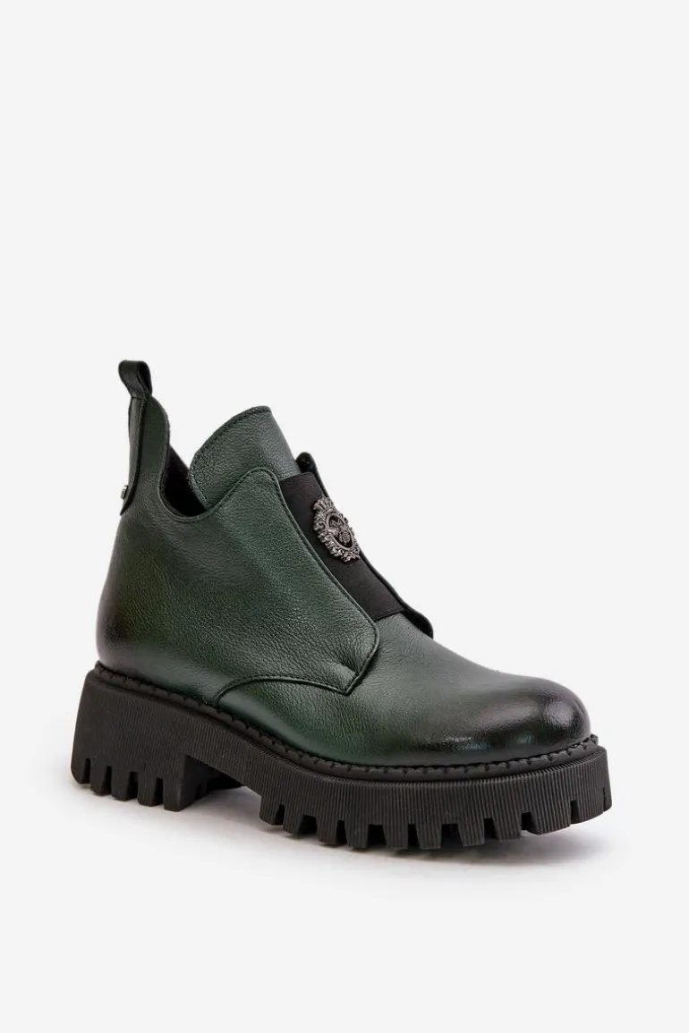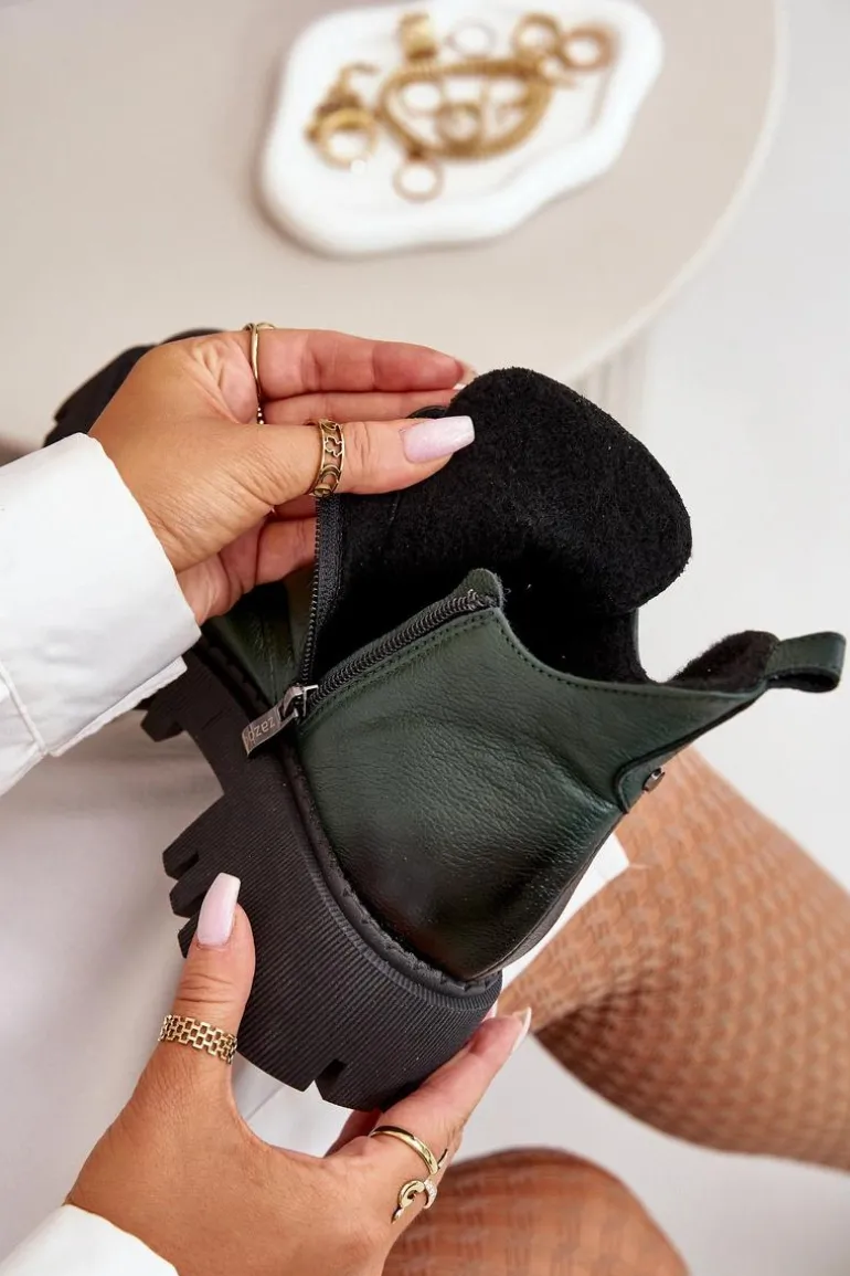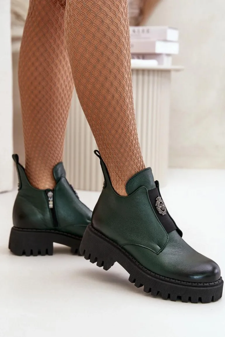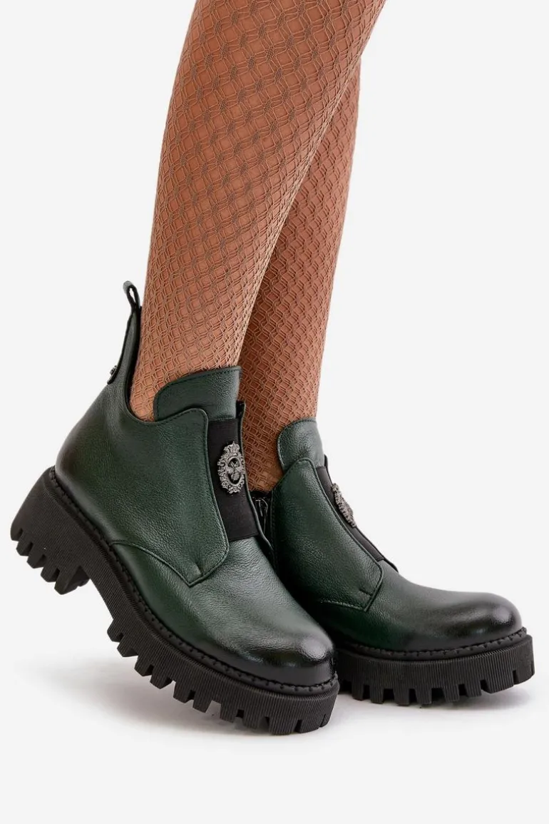 Damskie botki zostały wykonane z wysokiej jakości naturalnej skóry. Osadzone na masywnym obcasie i platformie ze żłobieniami. Model zapinany na suwak po wewnętrznej stronie cholewki. Z przodu na elastycznej wstawce znajduje się ozdoba z tworzywa sztucznego. Wnętrze ocieplone kocem obuwniczym. Ten wyjątkowy model wzbogaci wiele Twoich stylizacji! Przy wyborze rozmiaru prosimy sugerować się tabelą rozmiarów.