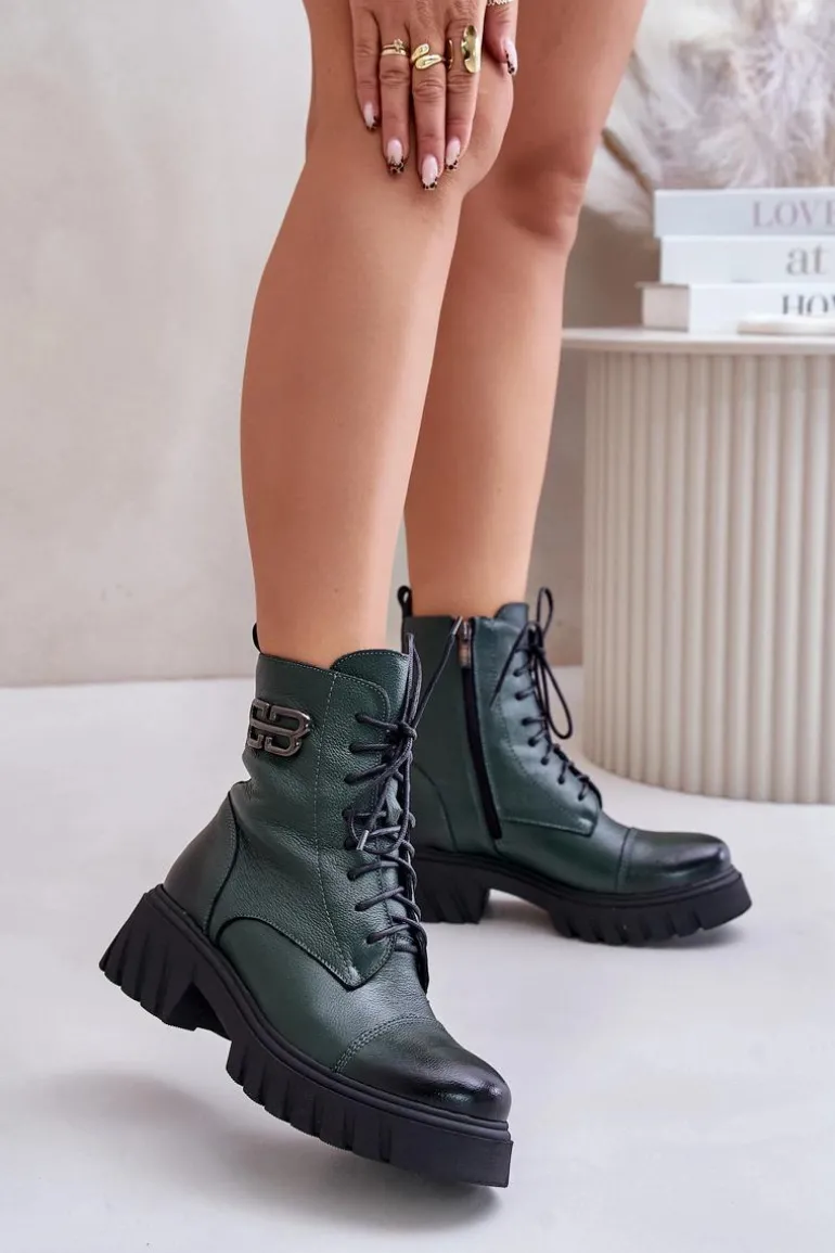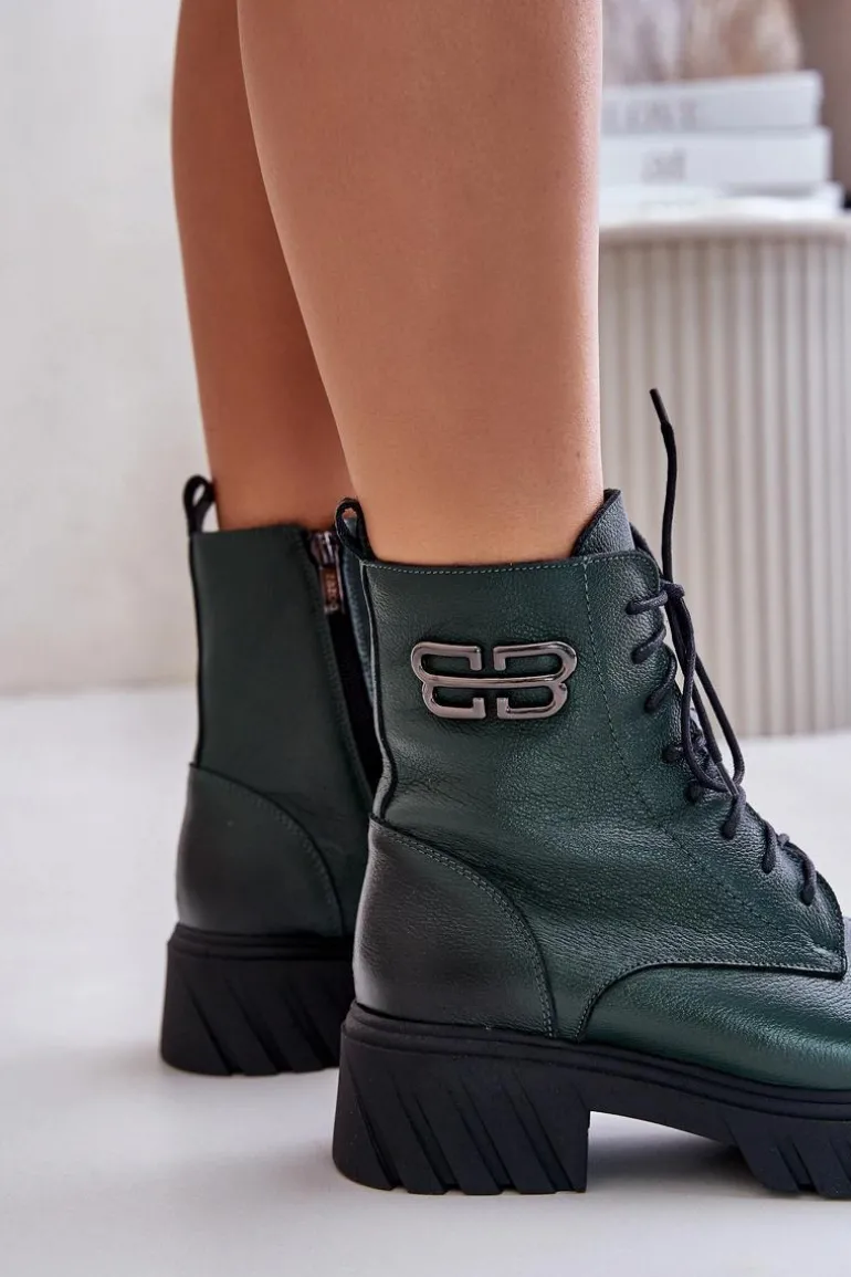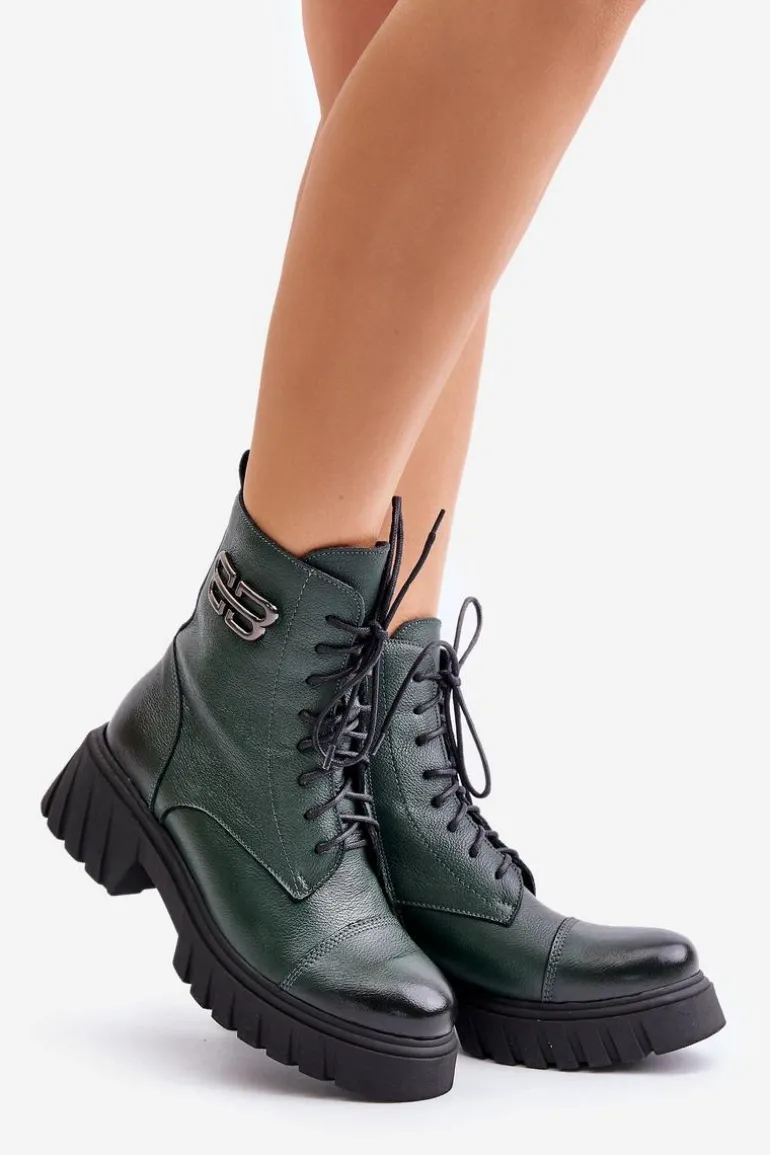Botki damskie wykonane ze skóry naturalnej. Osadzone na masywnym, płaskim obcasie i platformie. Posiadają zarówno sznurowanie, jak i zamek, co zapewnia wygodę zakładania i dopasowanie do stopy. Z boku cholewki ozdobny, złoty detal, który dodaje elegancji. Wnętrze ocieplone kocem obuwniczym. Idealne do jesiennych i zimowych stylizacji, te botki łączą elegancję z funkcjonalnością. Przy wyborze rozmiaru prosimy kierować się tabelą rozmiarów