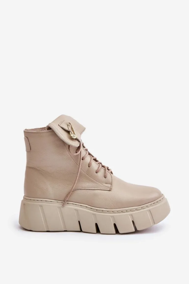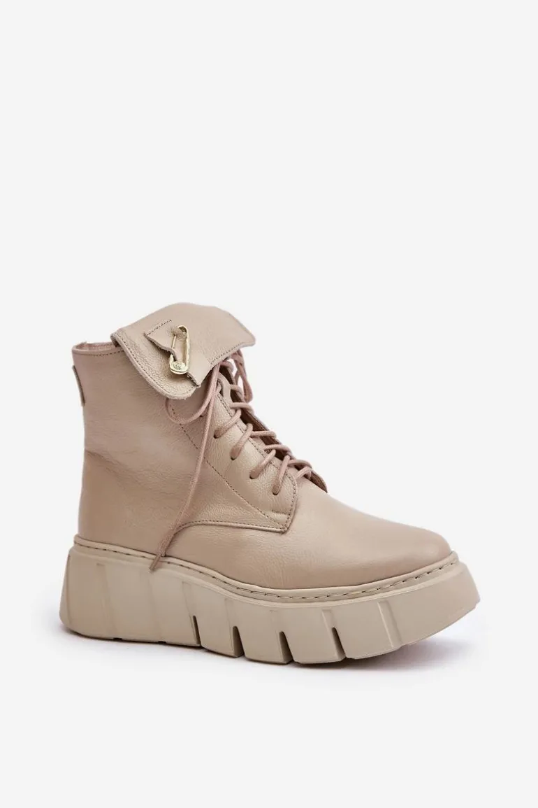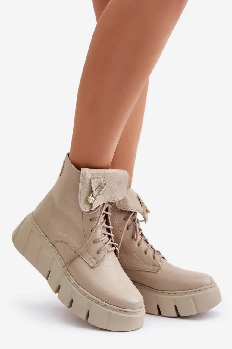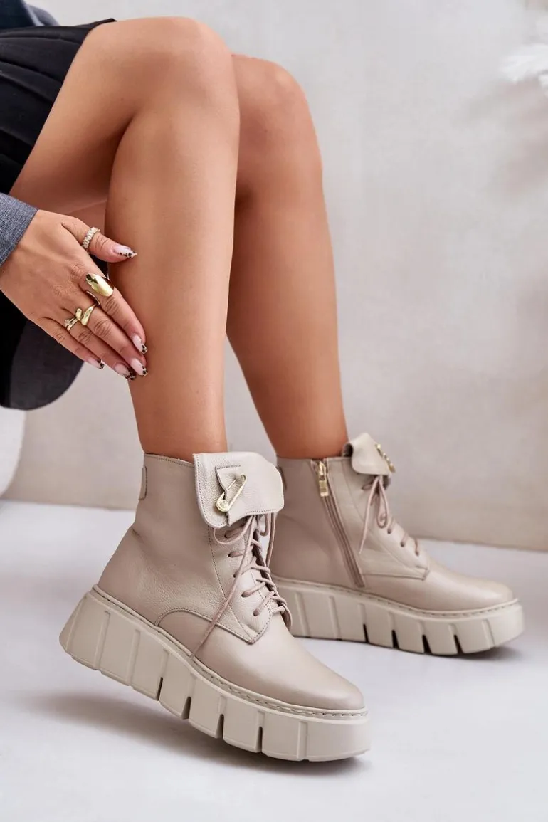 Damskie botki ze skóry naturalnej na platformie to idealne połączenie stylu i funkcjonalności. Posiadają zarówno sznurowanie, jak i zamek, co zapewnia wygodę zakładania i dopasowanie do stopy. Zaokrąglone noski dodają subtelności, a ozdoba w postaci agrafki wprowadza unikalny akcent. Wnętrze ocieplone kocem obuwniczym gwarantuje ciepło i komfort, sprawiając, że są doskonałym wyborem na chłodniejsze dni. Przy wyborze rozmiaru prosimy kierować się tabelą rozmiarów