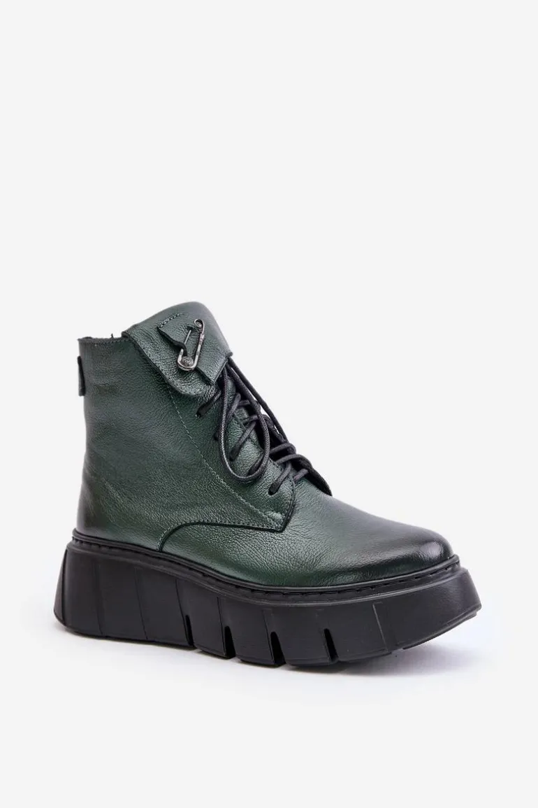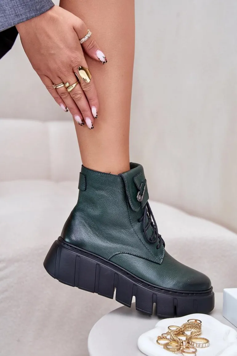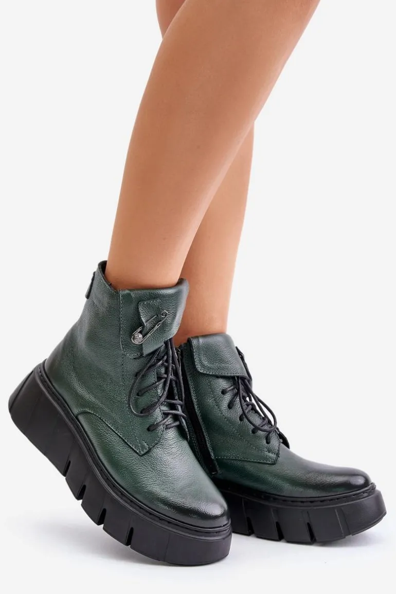 Damskie botki ze skóry naturalnej na platformie to idealne połączenie stylu i funkcjonalności. Posiadają zarówno sznurowanie, jak i zamek, co zapewnia wygodę zakładania i dopasowanie do stopy. Zaokrąglone noski dodają subtelności, a ozdoba w postaci agrafki wprowadza unikalny akcent. Wnętrze ocieplone kocem obuwniczym gwarantuje ciepło i komfort, sprawiając, że są doskonałym wyborem na chłodniejsze dni. Przy wyborze rozmiaru prosimy kierować się tabelą rozmiarów
