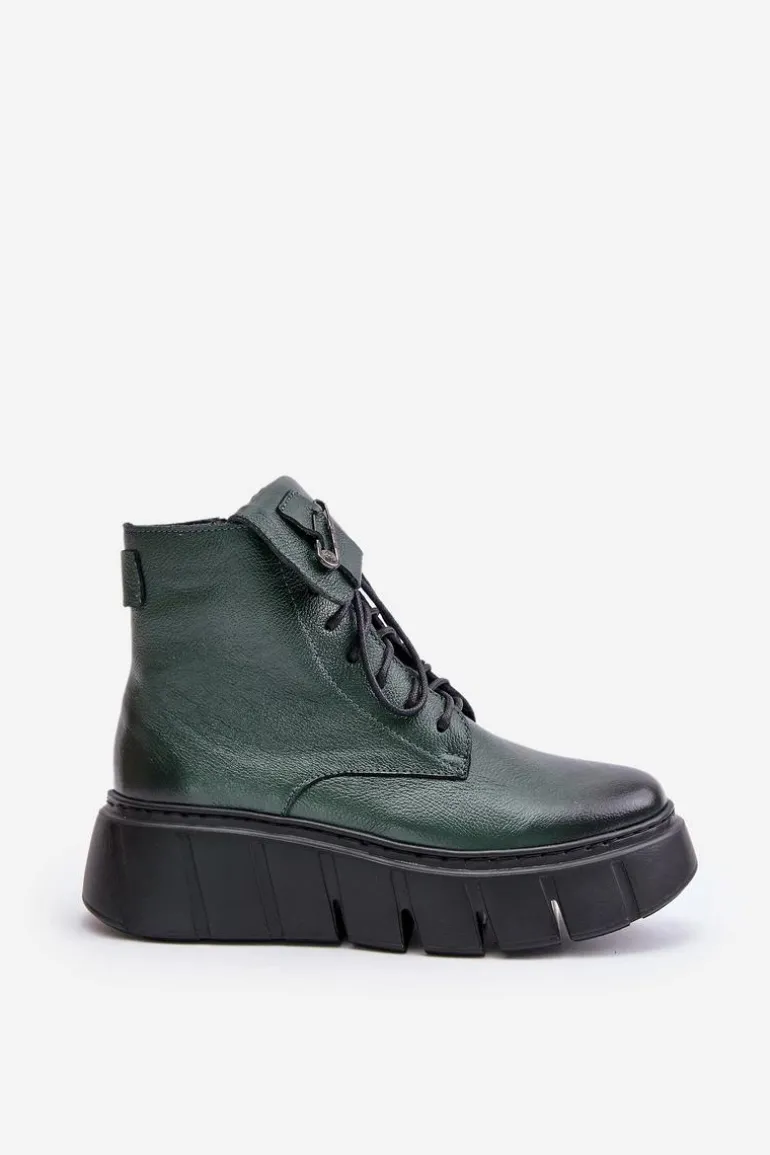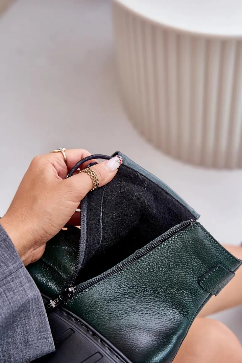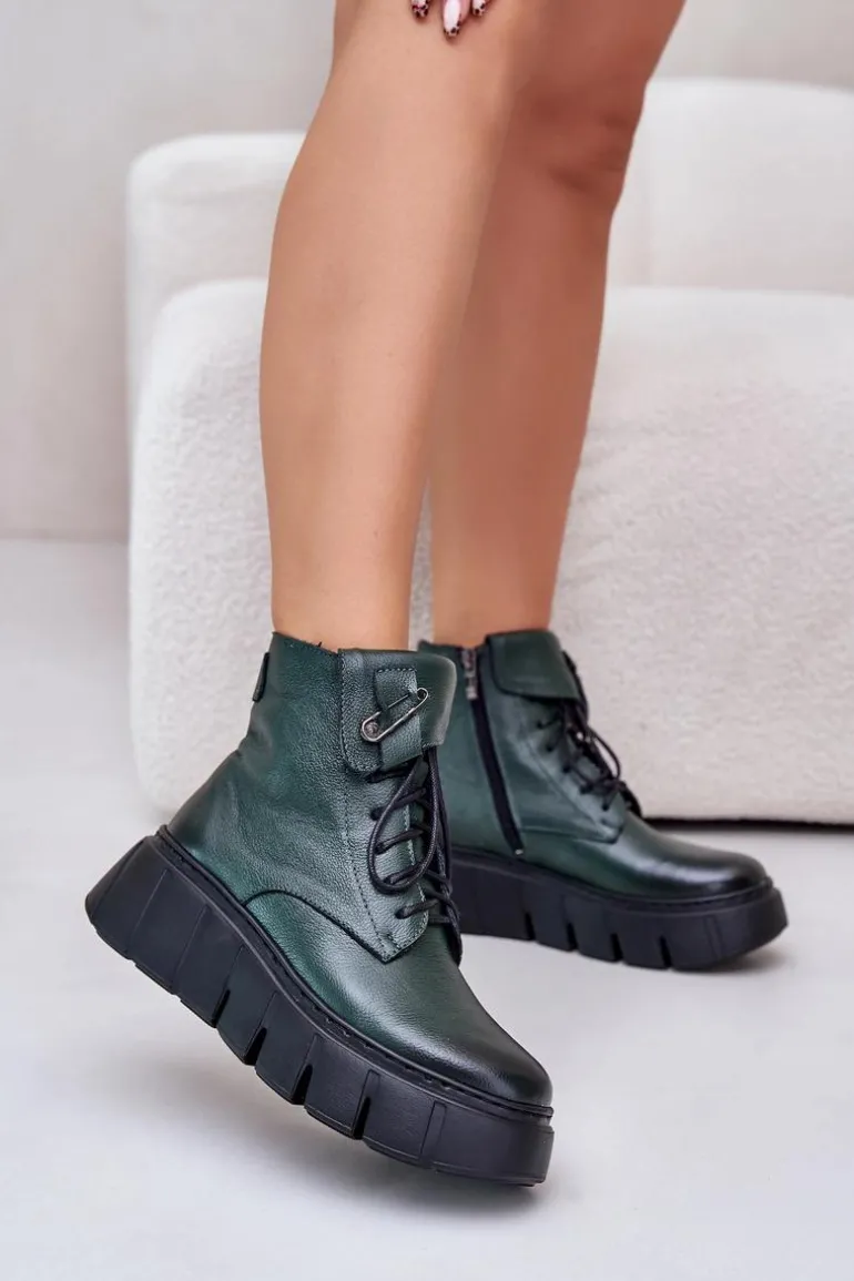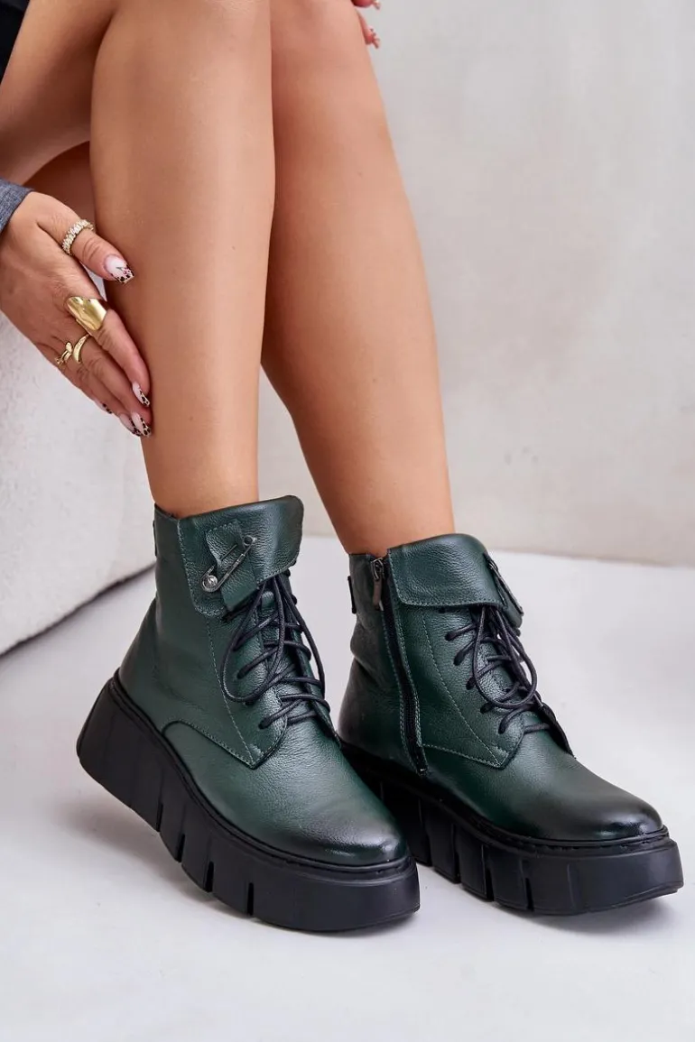 Damskie botki ze skóry naturalnej na platformie to idealne połączenie stylu i funkcjonalności. Posiadają zarówno sznurowanie, jak i zamek, co zapewnia wygodę zakładania i dopasowanie do stopy. Zaokrąglone noski dodają subtelności, a ozdoba w postaci agrafki wprowadza unikalny akcent. Wnętrze ocieplone kocem obuwniczym gwarantuje ciepło i komfort, sprawiając, że są doskonałym wyborem na chłodniejsze dni. Przy wyborze rozmiaru prosimy kierować się tabelą rozmiarów