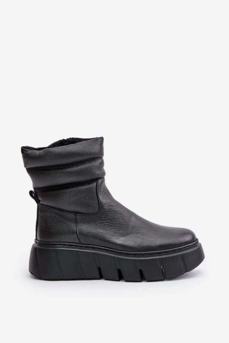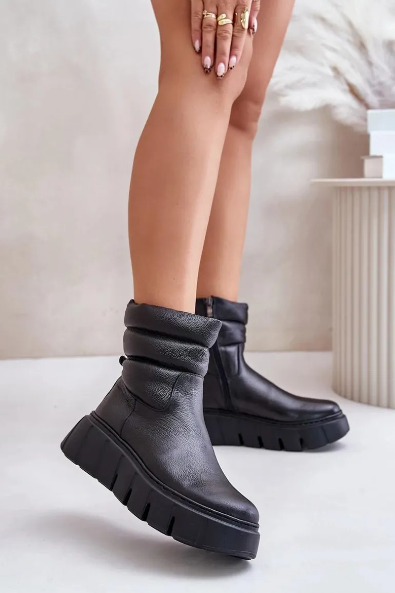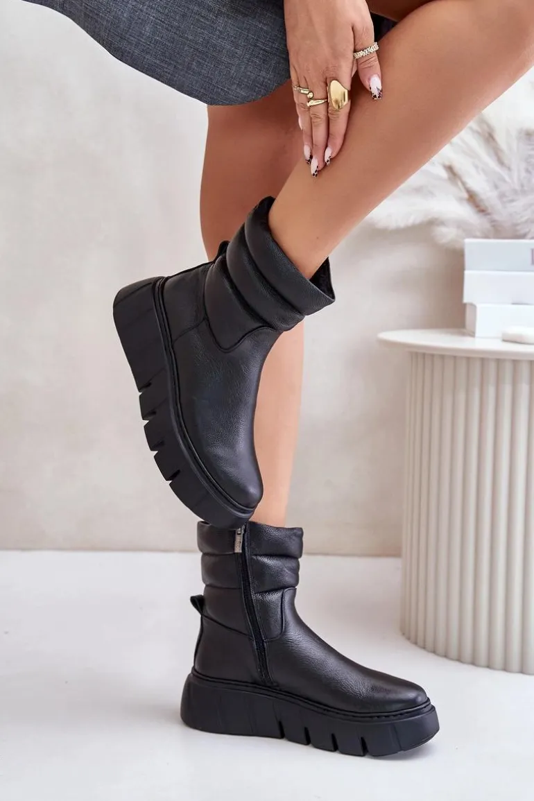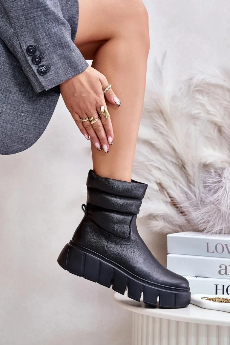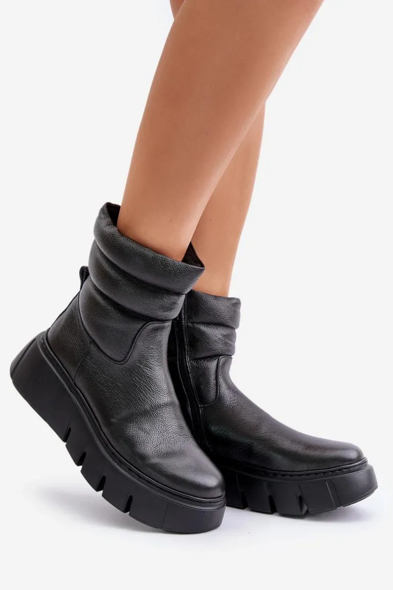 Damskie botki z wysokogatunkowej skóry naturalnej to doskonały wybór na jesień i zimę. Z boku cholewki posiadają praktyczny suwak, który ułatwia ich zakładanie. Osadzone na platformie z delikatnym koturnem, łączą w sobie nowoczesny styl i wygodę. Wnętrze ocieplone filcem zapewnia ciepło, a zaokrąglone noski dodają klasycznego uroku. Ten model z pewnością będzie świetnym dodatkiem do wielu jesienno-zimowych stylizacji. Przy wyborze rozmiaru prosimy kierować się tabelą rozmiarów