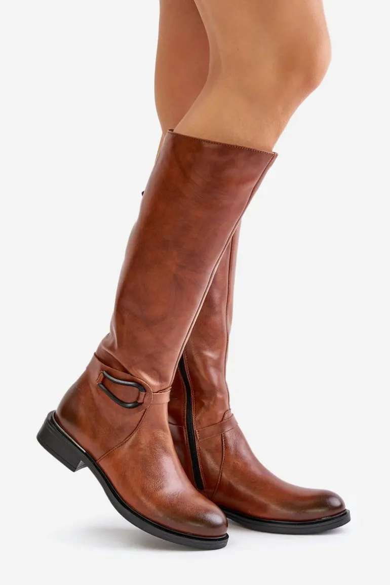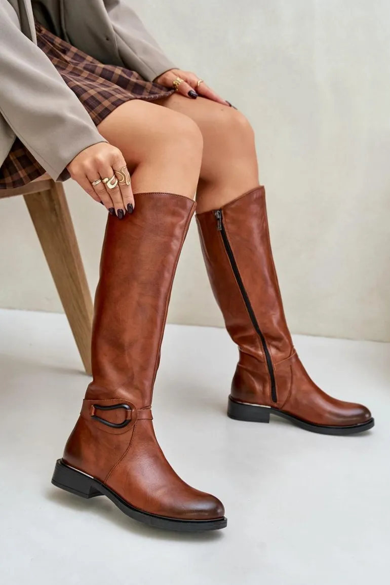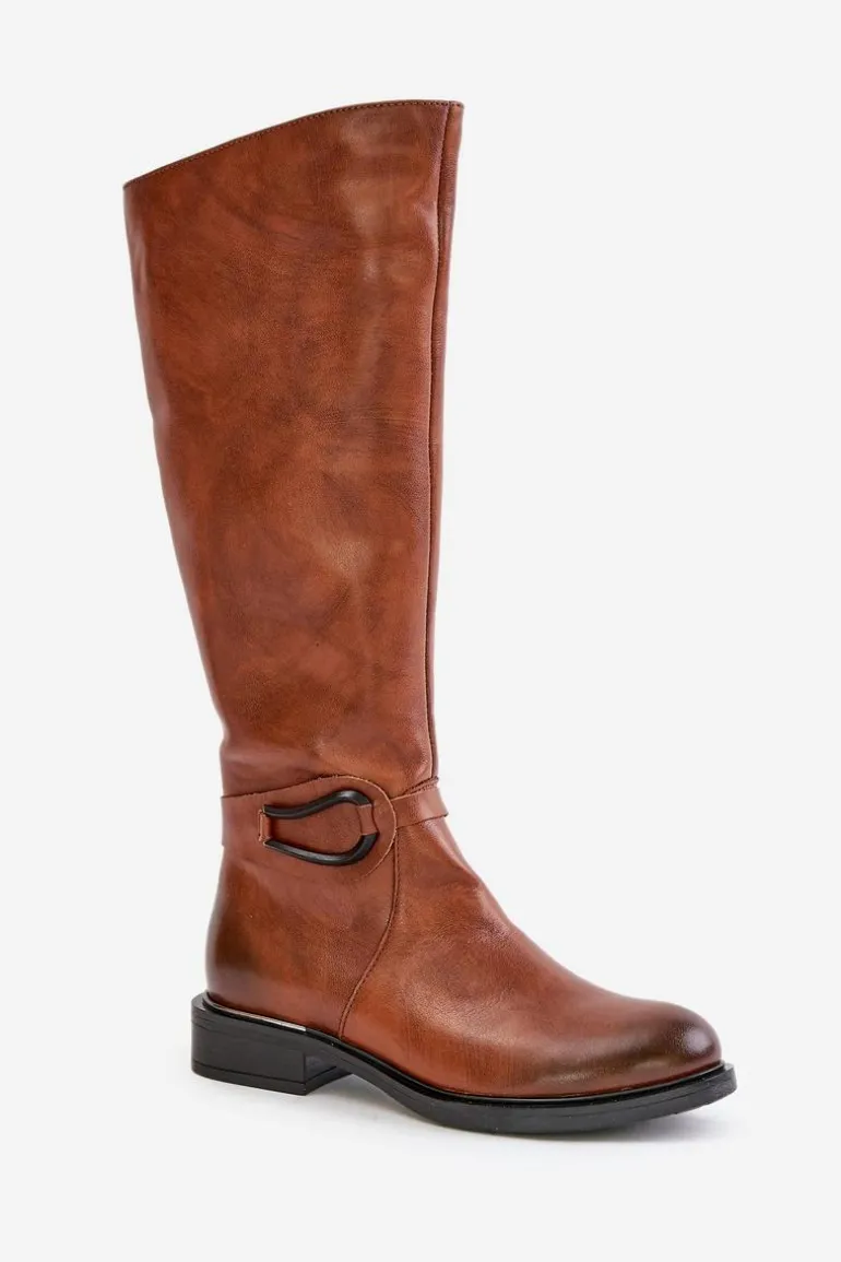 Damskie kozaki wykonane z naturalnej skóry stanowią eleganckie i komfortowe rozwiązanie. Dzięki płaskiemu obcasowi, użytkowanie przez cały dzień jest niezwykle wygodne. Cholewka sięgająca przed kolano dodaje elegancji i doskonale pasuje do różnorodnych stylizacji. Zapinane na zamek, co ułatwia zakładanie. Ozdobny pasek na cholewce nadaje wyjątkowego charakteru. Idealne zarówno na codzienne wyjścia, jak i na specjalne okazje, te kozaki będą znakomitym dodatkiem do Twojej garderoby! Przy wyborze rozmiaru prosimy sugerować się tabelą rozmiarów.