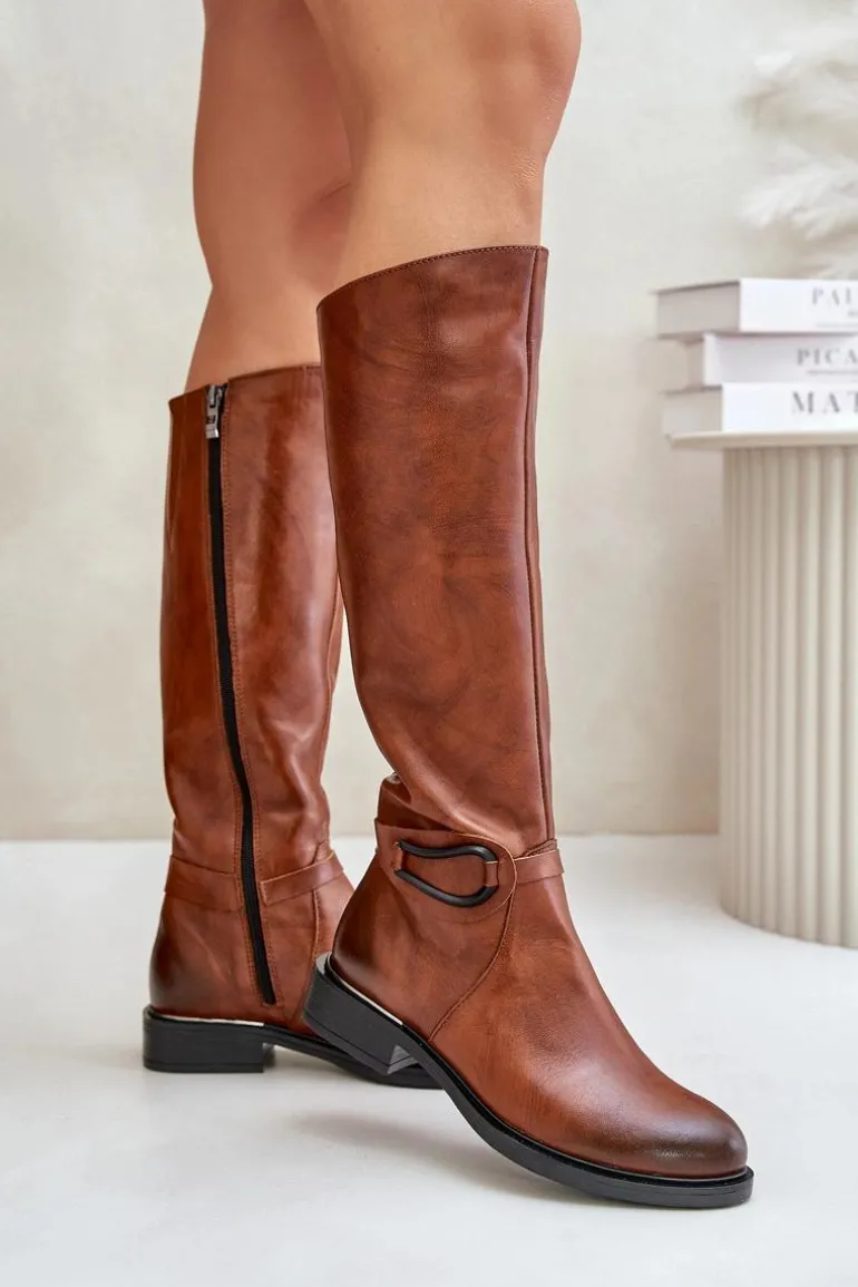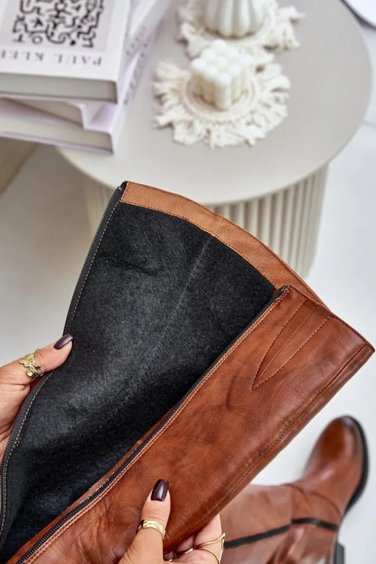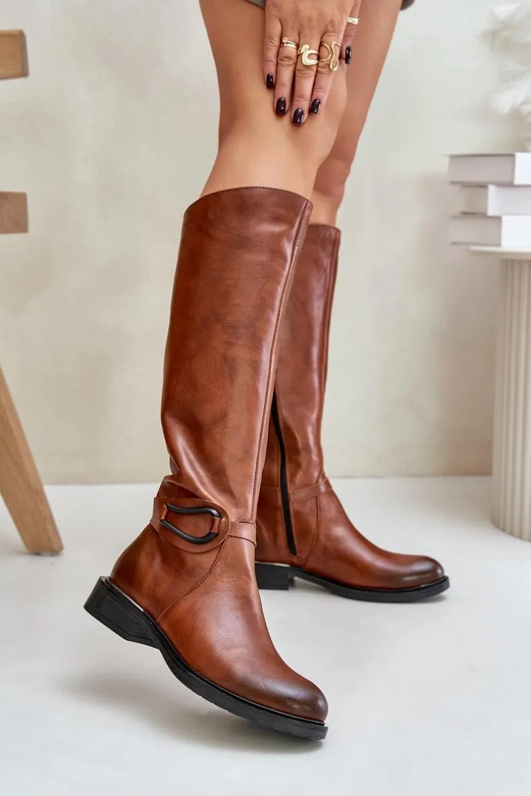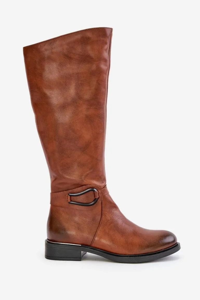 Damskie kozaki wykonane z naturalnej skóry stanowią eleganckie i komfortowe rozwiązanie. Dzięki płaskiemu obcasowi, użytkowanie przez cały dzień jest niezwykle wygodne. Cholewka sięgająca przed kolano dodaje elegancji i doskonale pasuje do różnorodnych stylizacji. Zapinane na zamek, co ułatwia zakładanie. Ozdobny pasek na cholewce nadaje wyjątkowego charakteru. Idealne zarówno na codzienne wyjścia, jak i na specjalne okazje, te kozaki będą znakomitym dodatkiem do Twojej garderoby! Przy wyborze rozmiaru prosimy sugerować się tabelą rozmiarów.