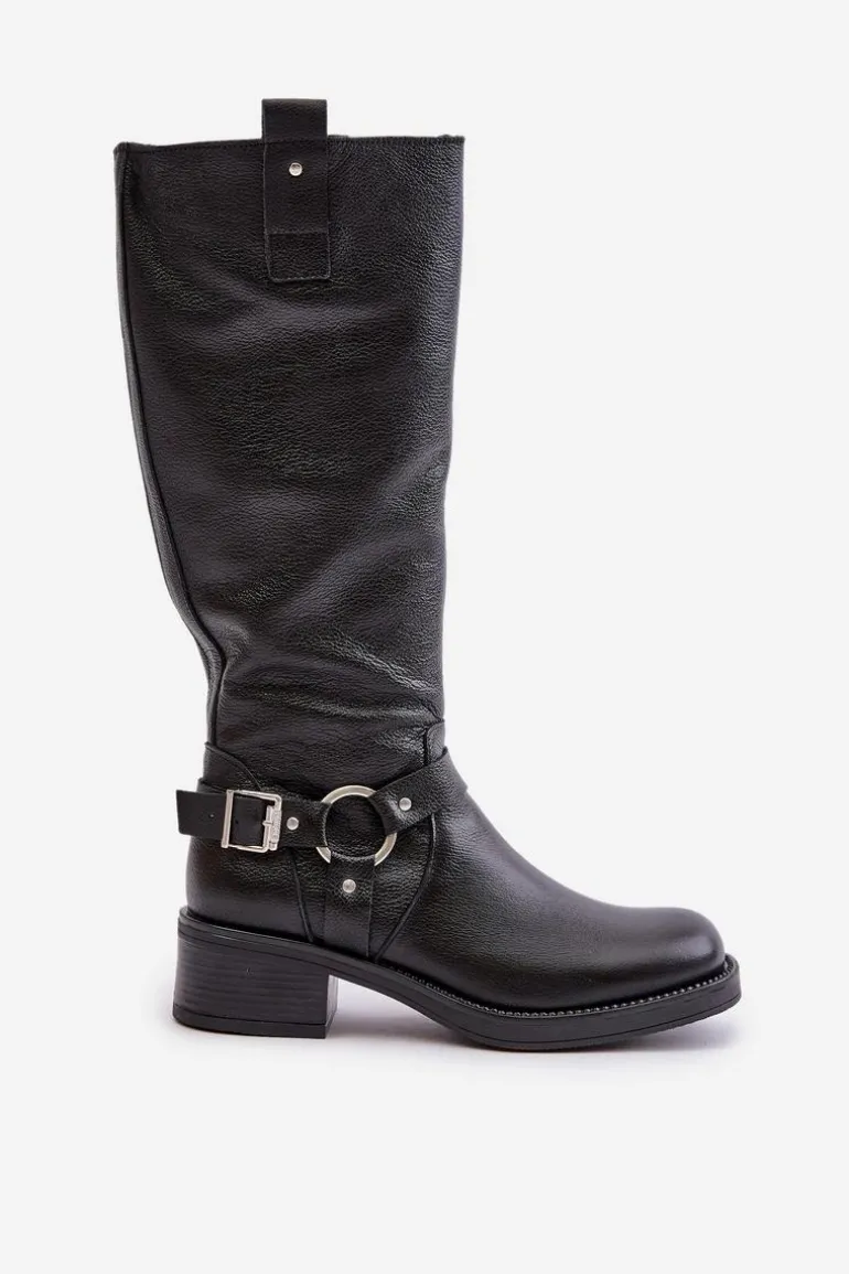 Damskie kozaki wykonane z naturalnej skóry. Cholewka, sięgająca przed kolano, dodaje elegancji i doskonale współgra z różnorodnymi stylizacjami. Subtelny wygląd zapewniają zaokrąglone noski. Model zapinany na zamek, co ułatwia zakładanie, a ozdobne paski na cholewce nadają im charakteru. Środek ocieplany filcem. Te idealne na co dzień i wyjątkowe wydarzenia kozaki będą świetnym uzupełnieniem Twojej garderoby! Przy wyborze rozmiaru prosimy sugerować się tabelą rozmiarów.