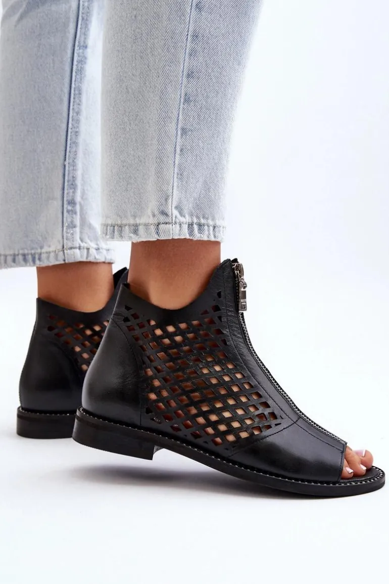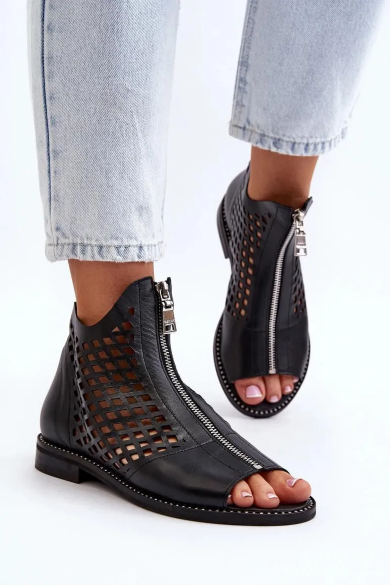 Zazoo 977/L Skórzane Ażurowe Sandały Na Zamek Czarne