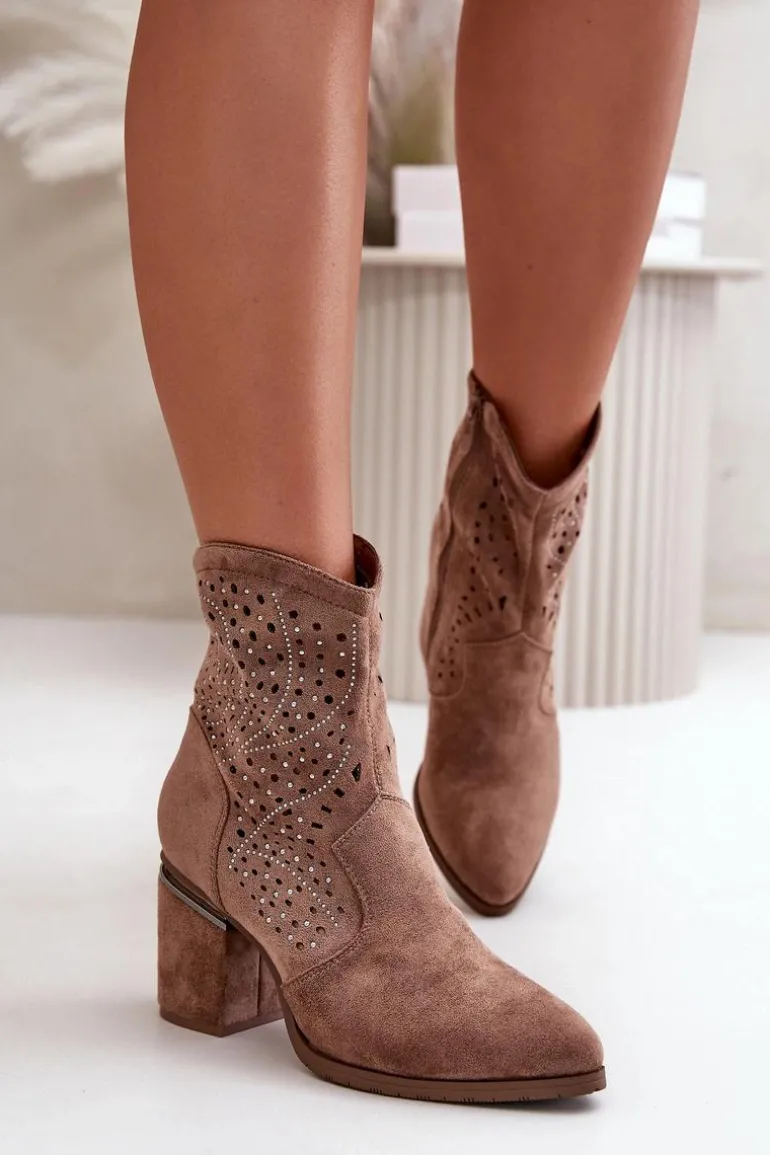 Zdobione Ażurowe Botki Damskie Na Słupku Z Eko Zamszu Brązowe S.Barski HY42-029