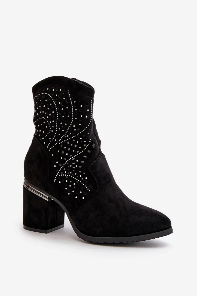 Eleganckie ażurowe botki damskie wykonane z wysokiej jakości eko zamszu. Osadzone na stabilnym słupkowym obcasie. Noski w szpic. Model zapinany na zamek zapewnia wygodę i łatwość zakładania. Idealne na różne okazje, te botki będą stylowym uzupełnieniem Twojej garderoby. Przy wyborze rozmiaru prosimy sugerować się tabelą rozmiarów.