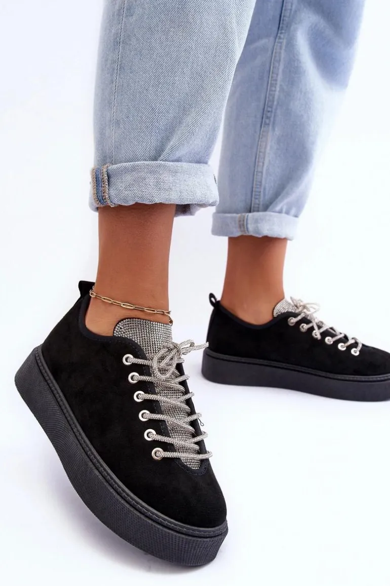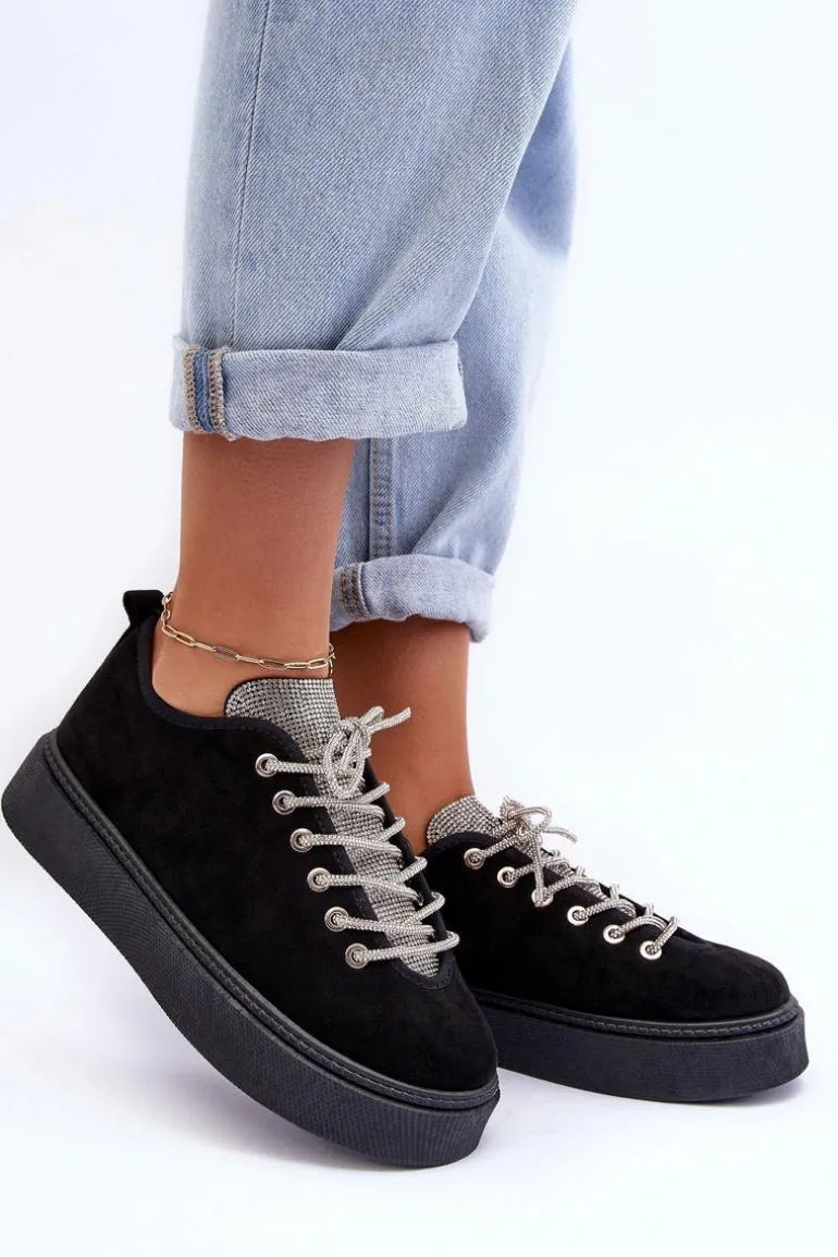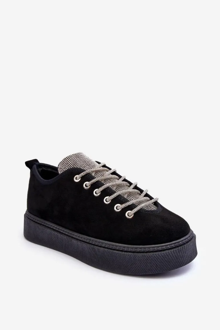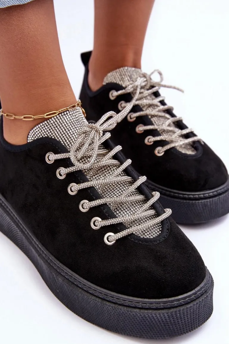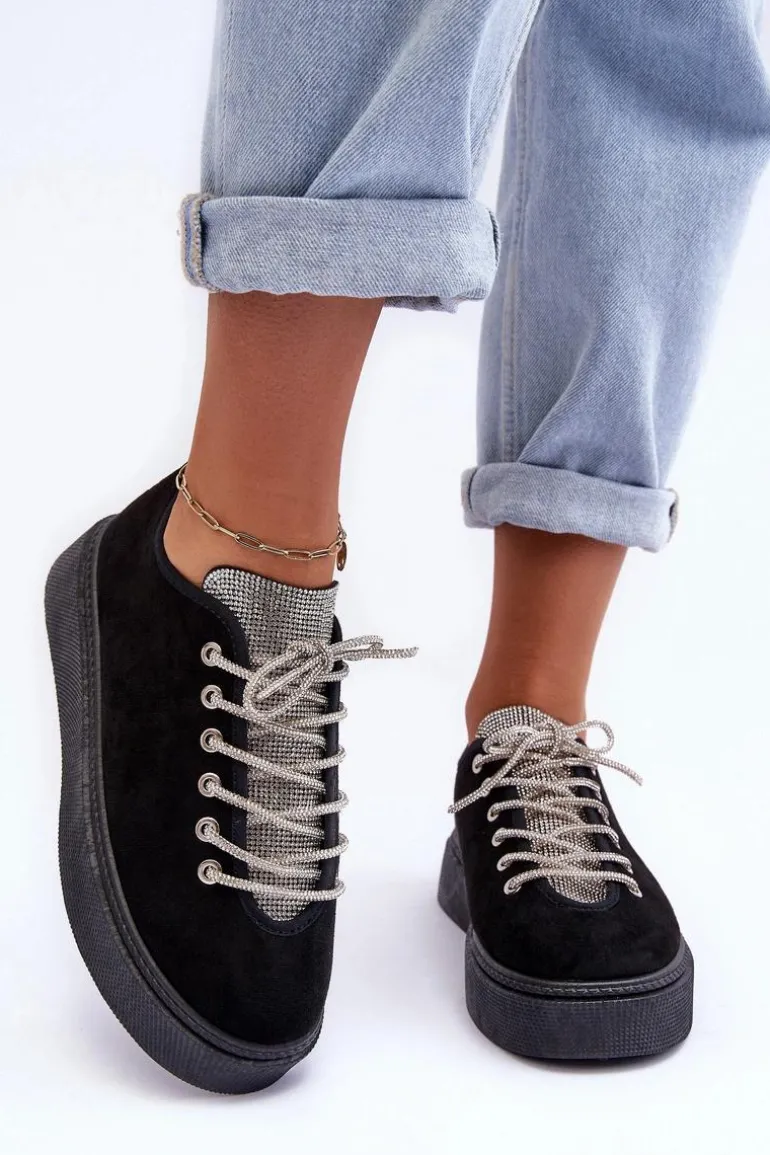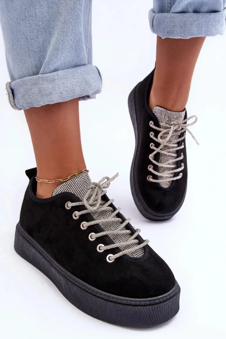 Stylowe buty sportowe damskie wykonane z eko zamszu. Ozdobione małymi, błyszczącymi dżetami. Noski zaokrąglone. Miękka wkładka zapewni komfort podczas użytkowania. Ten model powinien znaleźć się w Twojej szafie! Przy wyborze rozmiaru prosimy kierować się tabelą rozmiarów.